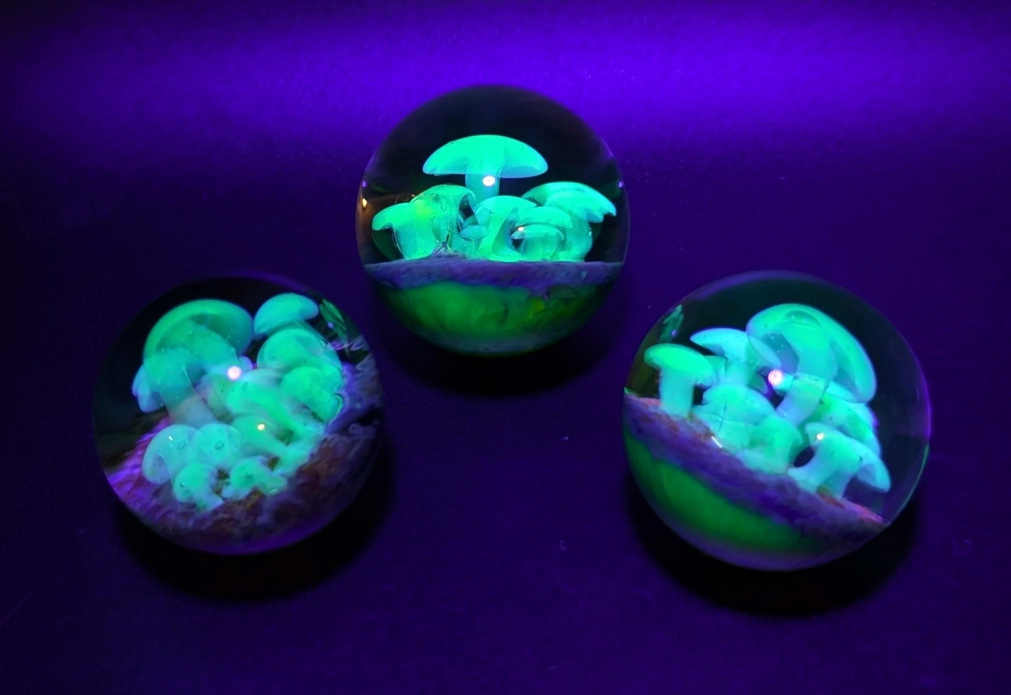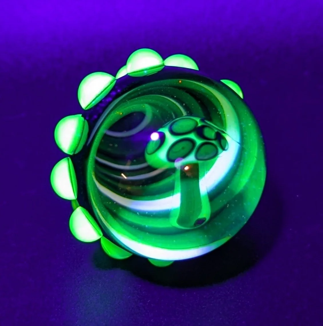 These beautiful uv reactive marbles with a forest of mushrooms in them made by Andrew average size 1.5” are perfect for your black light display