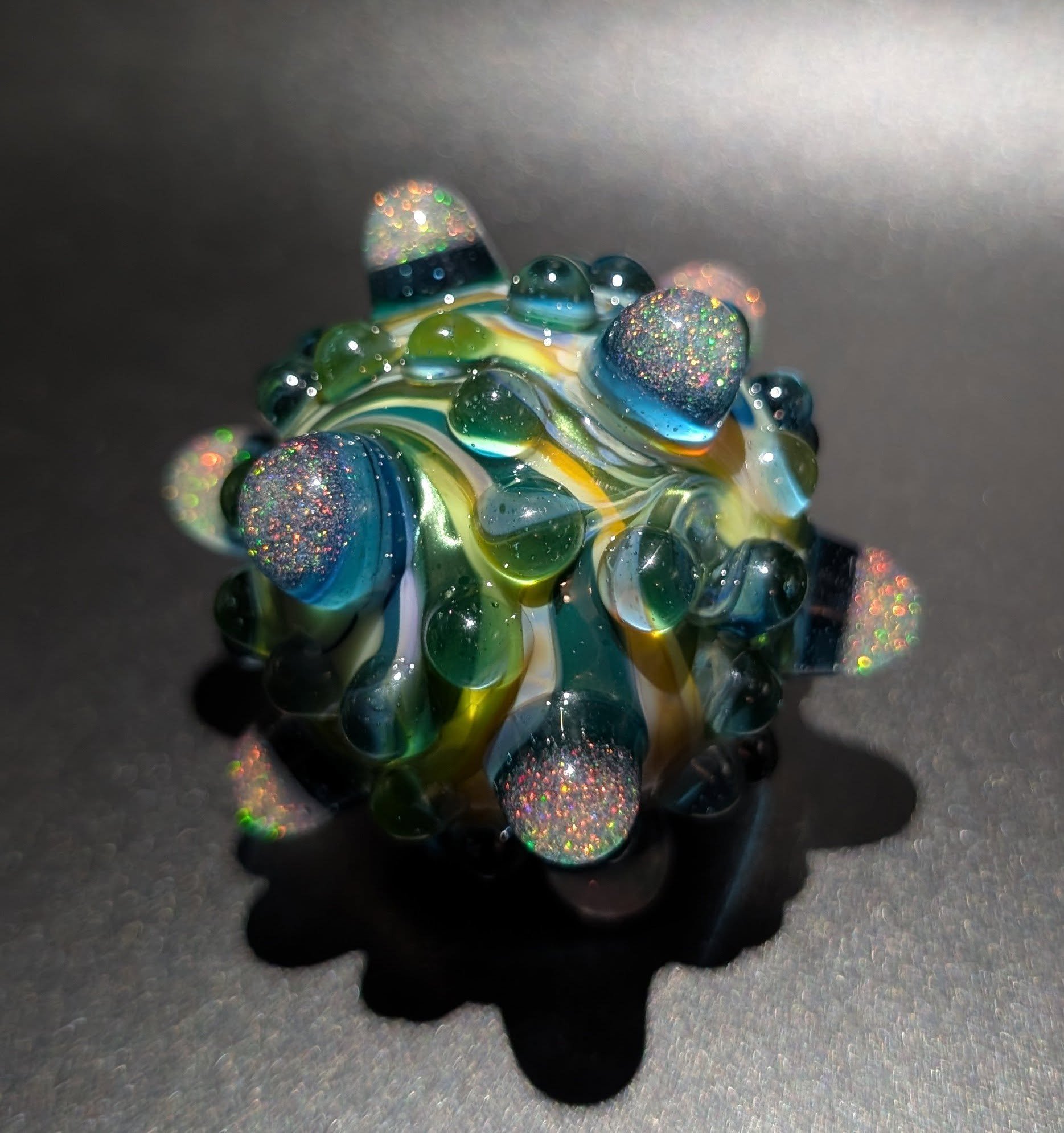 The two met working in a Lincoln City studio and officially joined creative forces in 2010. Inspired by the sea and the thrill of marble hunting, they later built a home torch-working studio specializing in borosilicate art glass. Andrew creates intricate hobnails, vortex marbles, and sculptural pieces, while Tina is known for her bold colorwork and striking patterns.