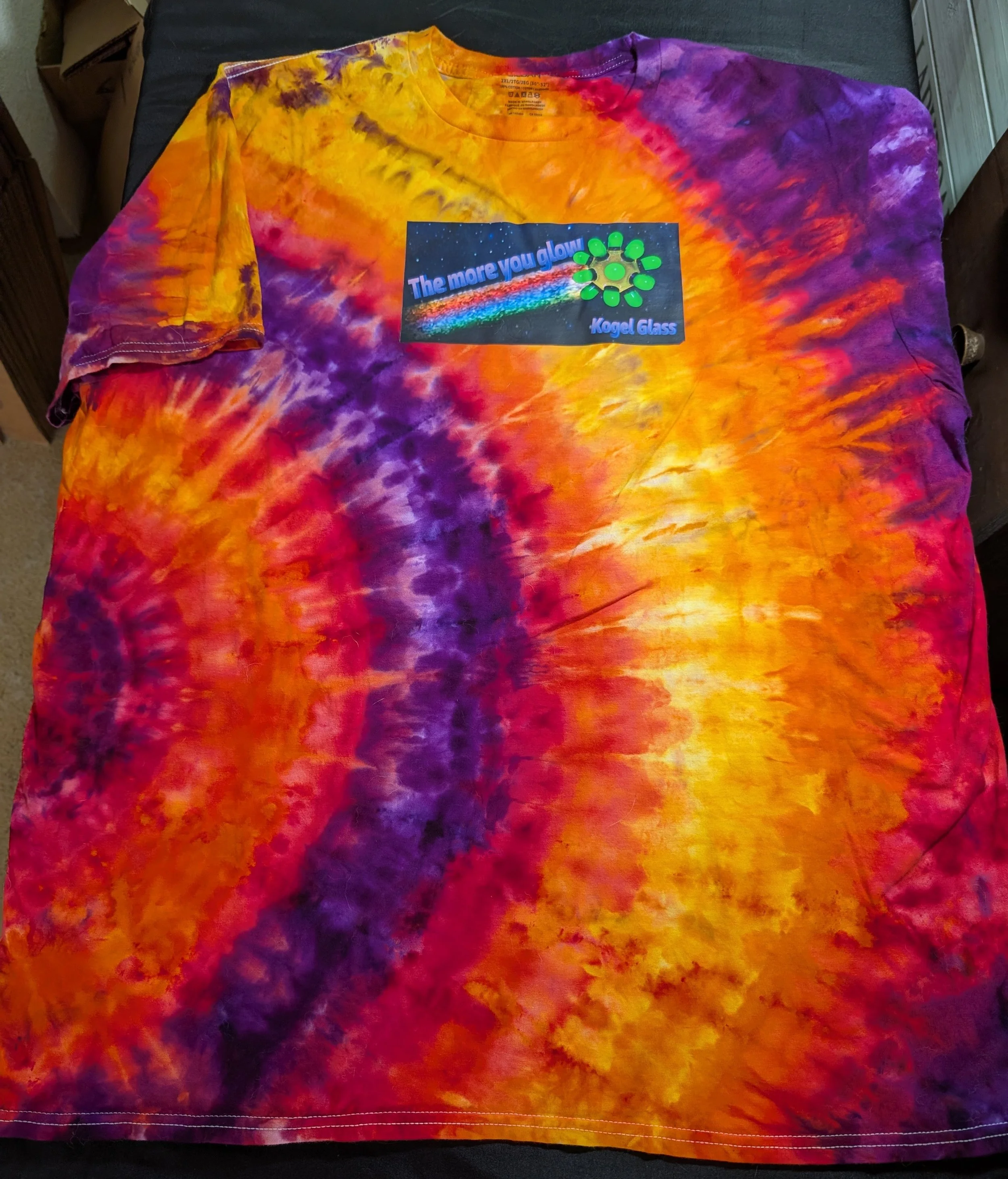 Shop › T-shirt XXL Image 1 of 2 Image 2 of 2 T-shirt XXL $40.00 XXL size T-shirt hand tie-dyed by Tina with glow in the dark Kogel Glass image on front Add To Cart Added! XXL size T-shirt hand tie-dyed by Tina with glow in the dark Kogel Glass image on front