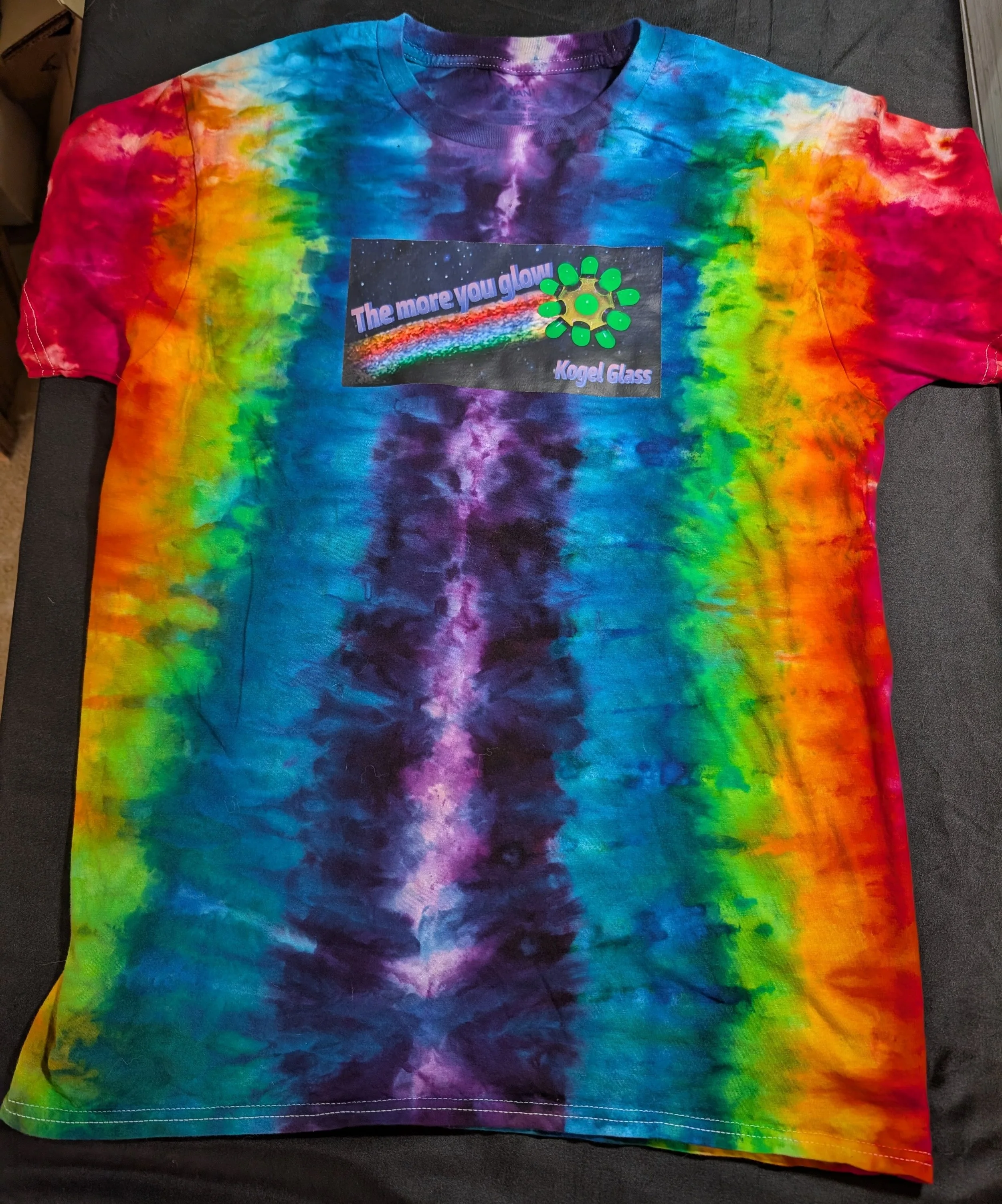Shop › T-shirt Medium Image 1 of 2 Image 2 of 2 T-shirt Medium $40.00 Medium size T-shirt hand tie-dyed by Tina with glow in the dark Kogel Glass image on front Add To Cart Added! Medium size T-shirt hand tie-dyed by Tina with glow in the dark Kogel Glass image on front