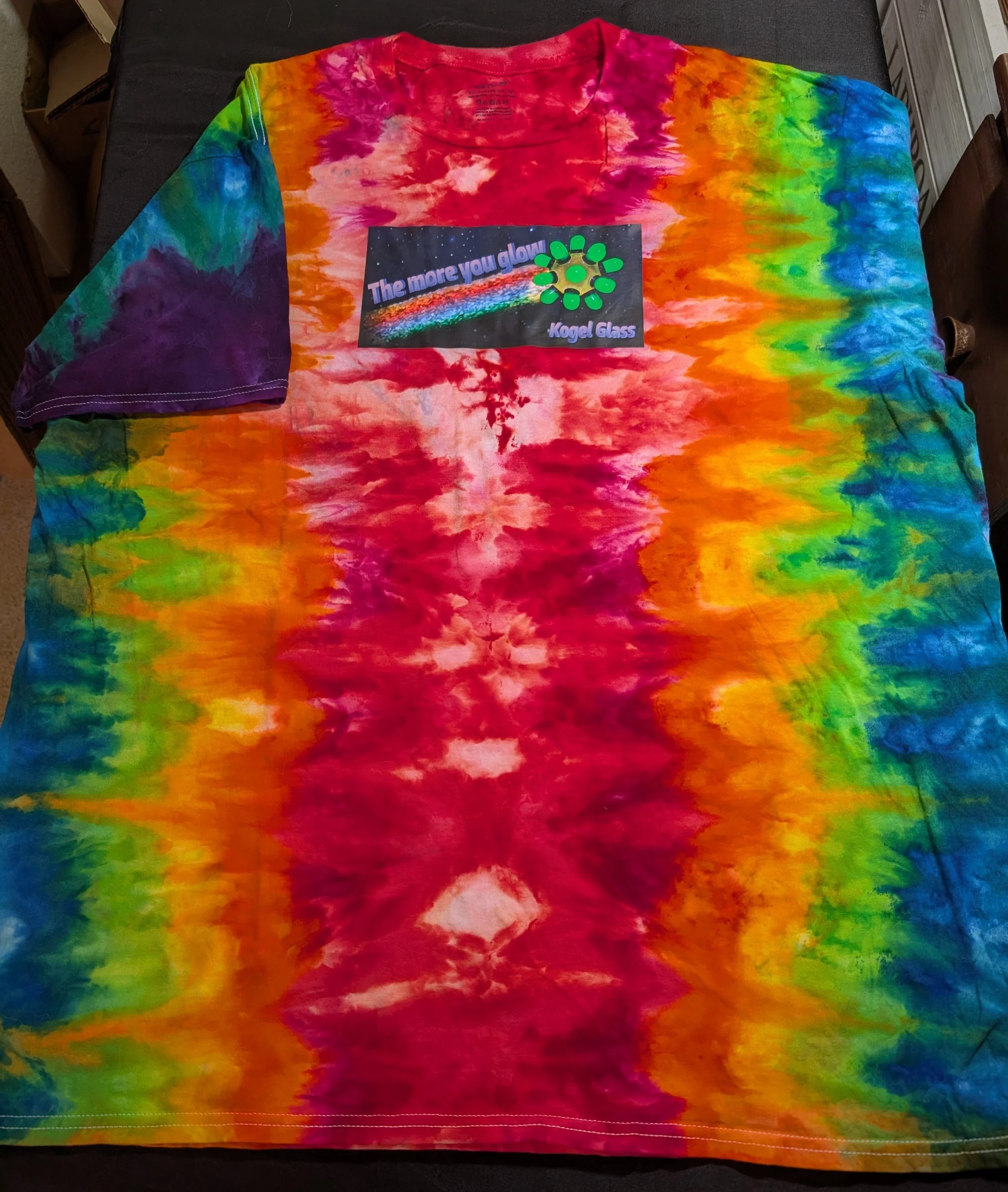 XXL size T-shirt hand tie-dyed by Tina with glow in the dark Kogel Glass image on front