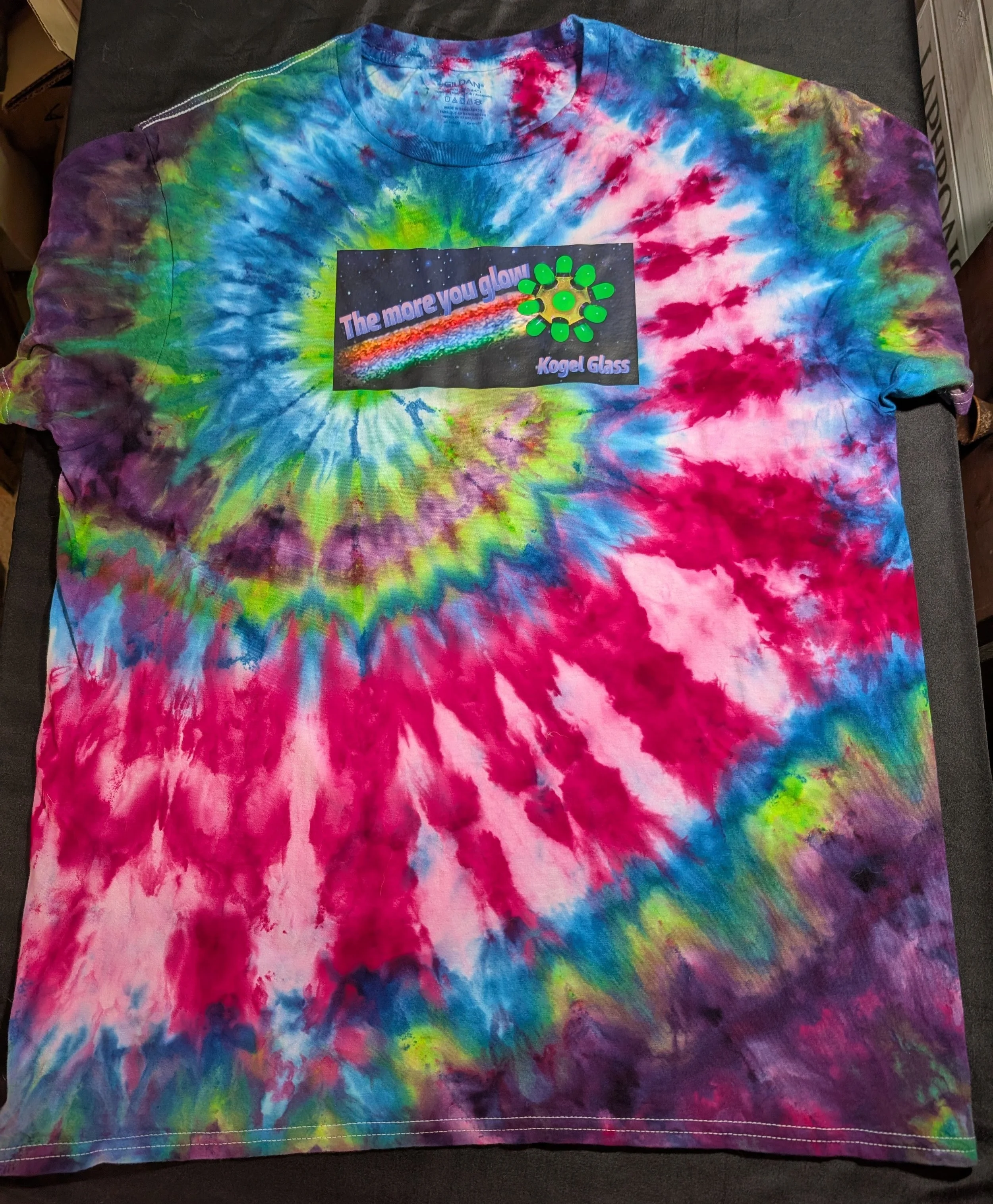 Shop › T-shirt Large Image 1 of 2 Image 2 of 2 T-shirt Large $40.00 Large size T-shirt hand tie-dyed by Tina with glow in the dark Kogel Glass image on front Add To Cart Added! Large size T-shirt hand tie-dyed by Tina with glow in the dark Kogel Glass image on front