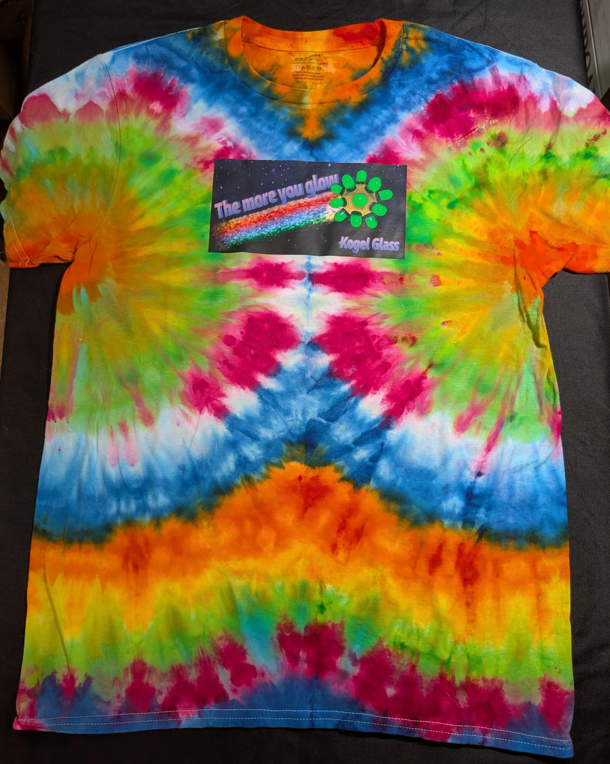 Medium size T-shirt hand tie-dyed by Tina with glow in the dark Kogel Glass image on front