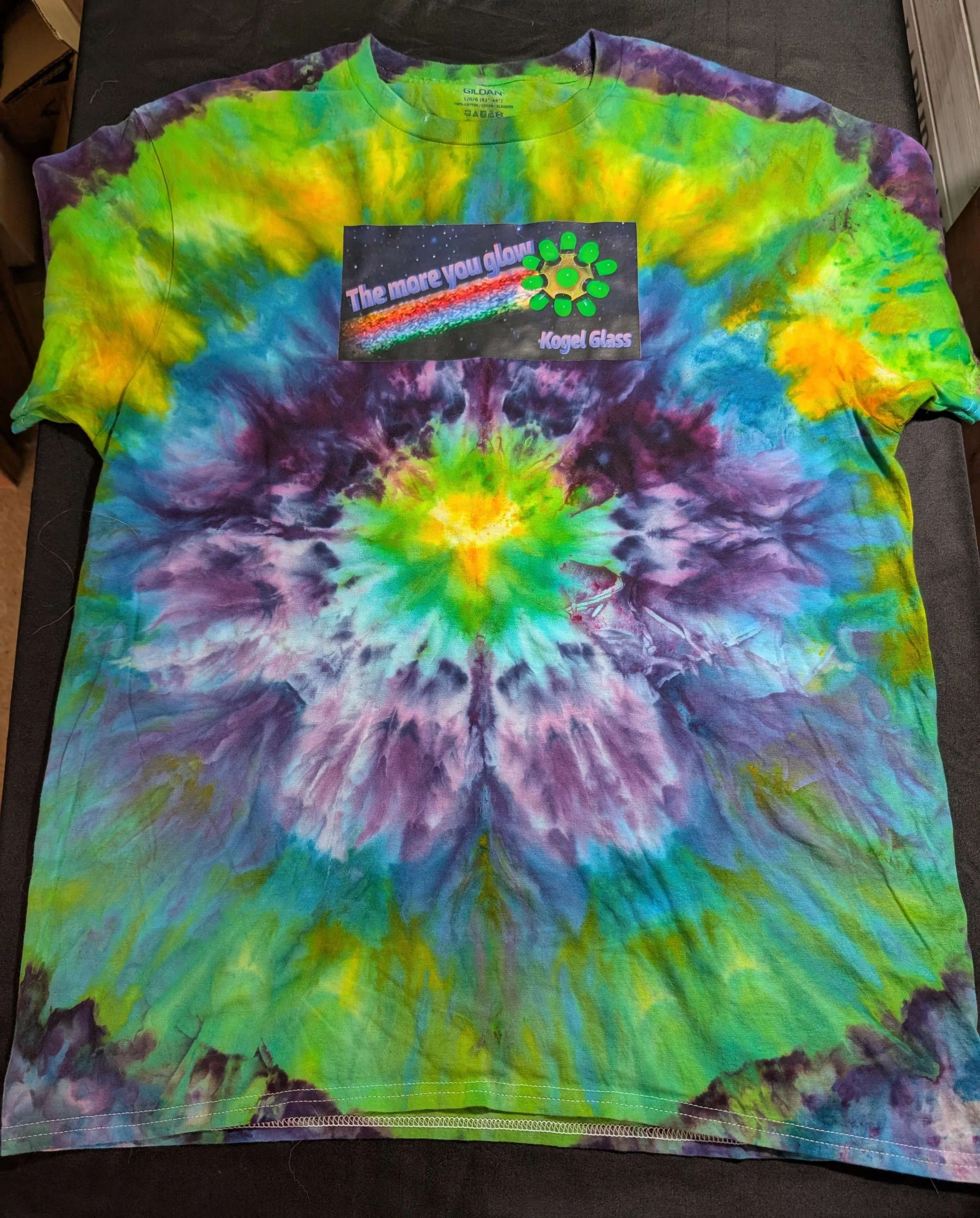 Shop › T-shirt Large Image 1 of 2 Image 2 of 2 T-shirt Large $40.00 sold out Large size T-shirt hand tie-dyed by Tina with glow in the dark Kogel Glass image on front Sold Out Added! Large size T-shirt hand tie-dyed by Tina with glow in the dark Kogel Glass image on front